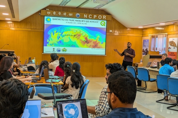 NCPOR organised a workshop on "Quantarctica and Figure-Making with QGIS" joined by over 35 participants. Special guest Dr. Kenichi Matsuoka from Norsk Polarinstitutt introduced Quantarctica, an open-source geospatial dataset collection for Antarctic research, followed by hands-on sessions by NCPOR scientists on creating publication-grade figures using QGIS.