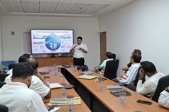 Dr. Avinash Kumar, Scientist-E, briefed the journalists on Arctic and Antarctic sea ice and its critical links to global climate change. The visit also featured an engaging Science on a Sphere (SOS) session, offering an immersive visual experience to better understand polar science and Earth’s changing climate.